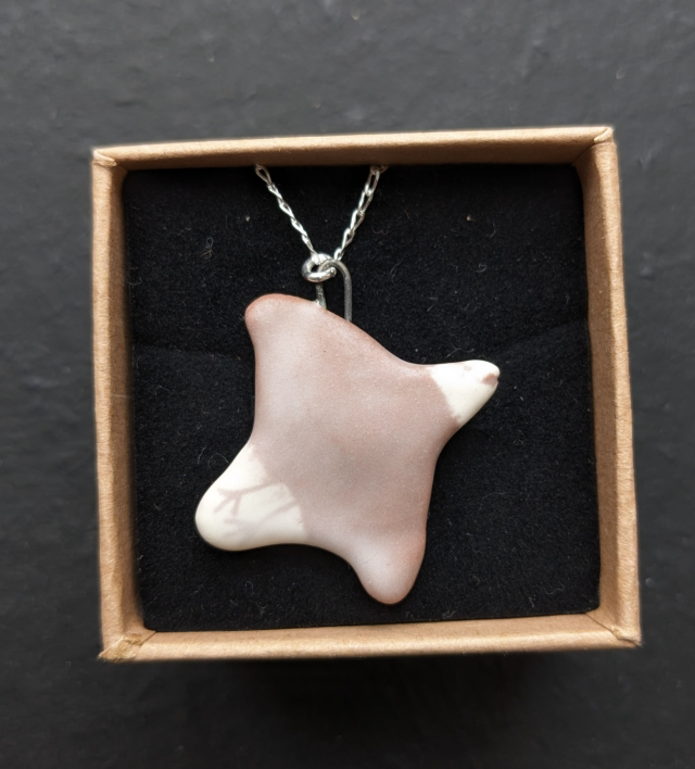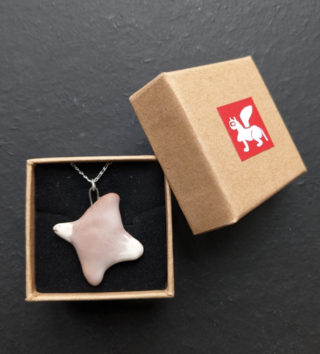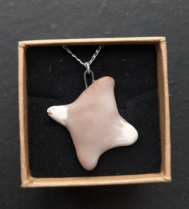Un pendentif en faïence, modelé et gravé à la main. Il est recouvert d'émail mat, monté sur une chaîne en argent 925 de 45 cm.