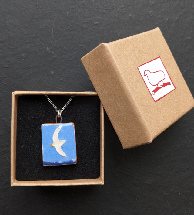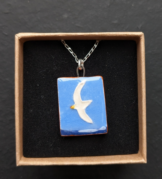 Un pendentif en faïence, peint à la main. Il a le devant émaillé et il est monté sur une chaîne en argent 925 de 45 cm.