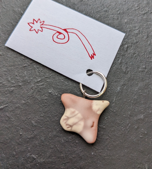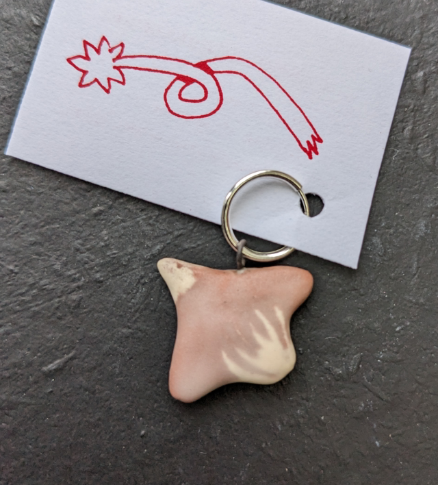 Un pendentif en faïence, dessiné et gravé à la main. Il est recouvert d'un émail mat et laiteux et il est monté sur une créole en argent 925.