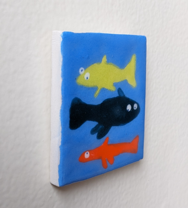Les carreaux sont tous peints à la main, ce sont des pièces uniques. Ils sont destinés à être accrochés au mur comme des petits tableaux et sont d'ailleurs vendus avec un clou pour cet effet.